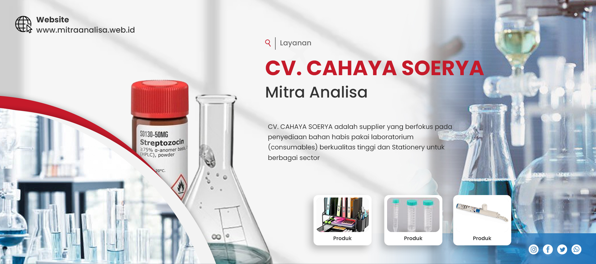 CV. CAHAYA SOERYA adalah supplier yang berfokus pada penyediaan bahan habis pakai laboratorium (consumables) berkualitas tinggi dan Stationery untuk berbagai sector. Didirikan pada tanggal 1 Februari 2020 di Kota Bogor, Jawa Barat. Kami berdedikasi untuk mendukung operasional laboratorium di seluruh Indonesia dengan memastikan ketersediaan produk esensial dan layanan yang andal. Kami memahami pentingnya akurasi dan efisiensi dalam setiap penelitian dan pengujian, oleh karena itu kami hanya menyediakan produk dari merek-merek terkemuka yang telah teruji kualitasnya.